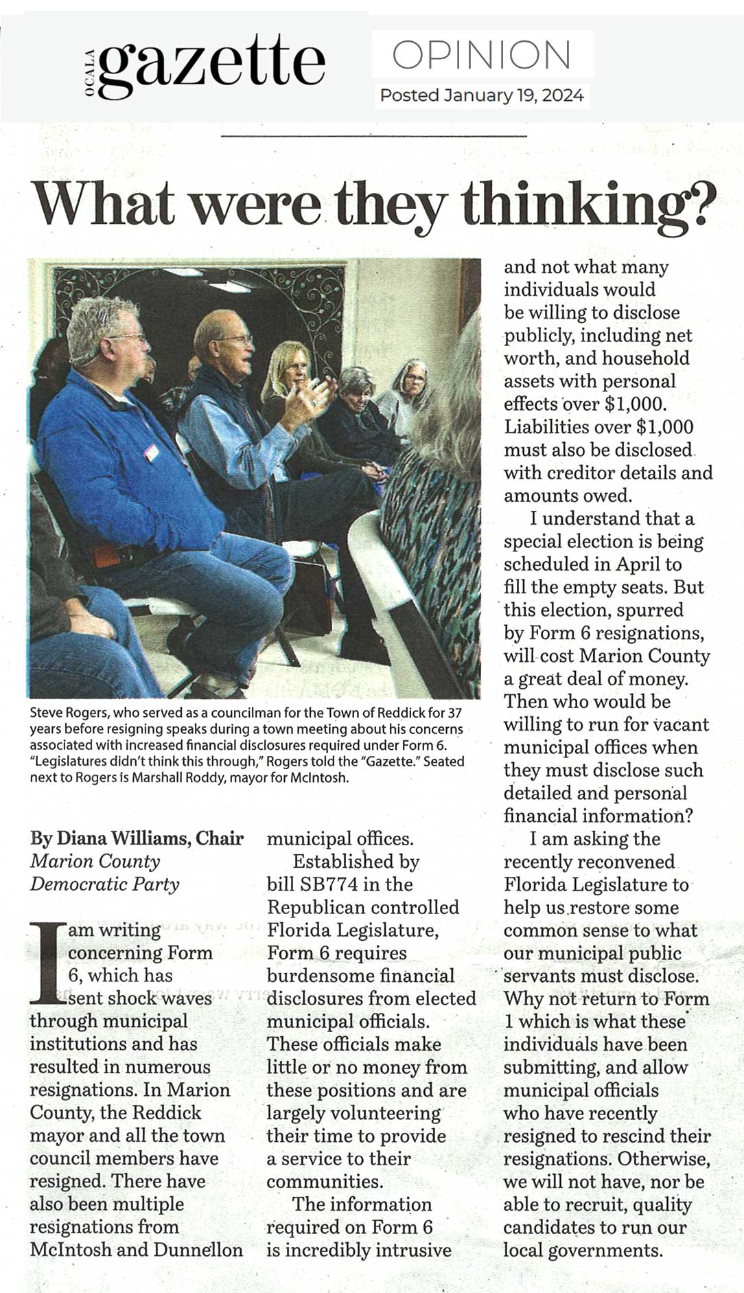 Our own Diana Williams, Chair of the Marion County Democratic Executive Committee, wrote a letter to the editor concerning Form 6, recently passed by our Florida legislature, that is causing mass resignations through municipal institutions all over the state, and locally affected Reddick, McIntosh and Dunnellon.