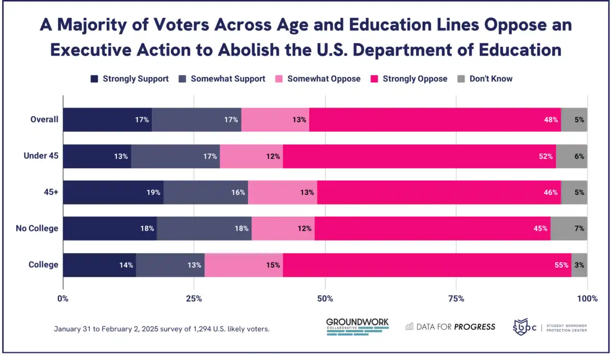 A majority of voters across age and education lines oppose an executive action to abolish the U.S. Department of Education, according to the Data for Progress survey conducted in February.